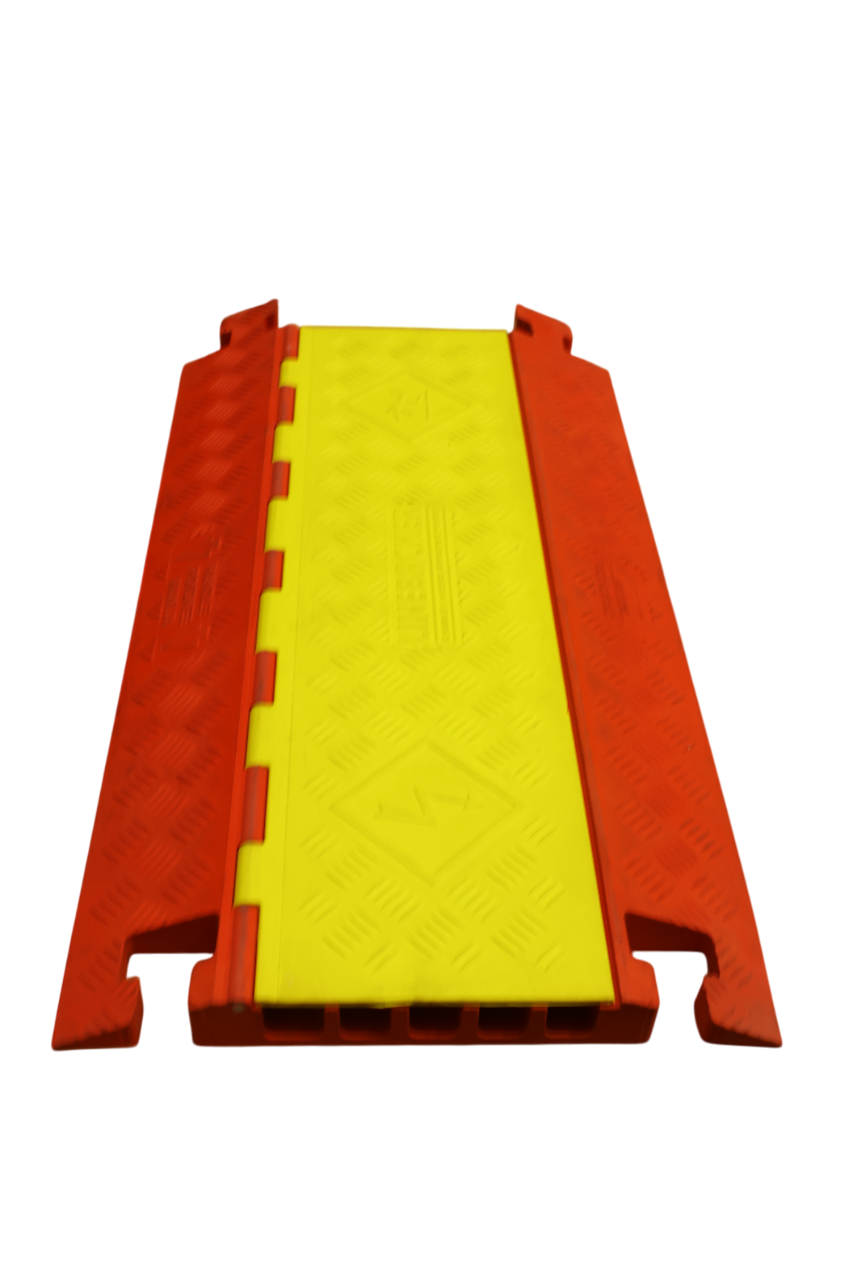 Protector de cable de 5 canales con diseño tipo T-Bone, ideal para zonas de alto tráfico vehicular, industrial o espectáculos. Su estructura robusta y materiales de alta resistencia permiten una capacidad de carga de hasta 19 toneladas. Incorpora una tapa amarilla de alta visibilidad y base roja para mayor seguridad.