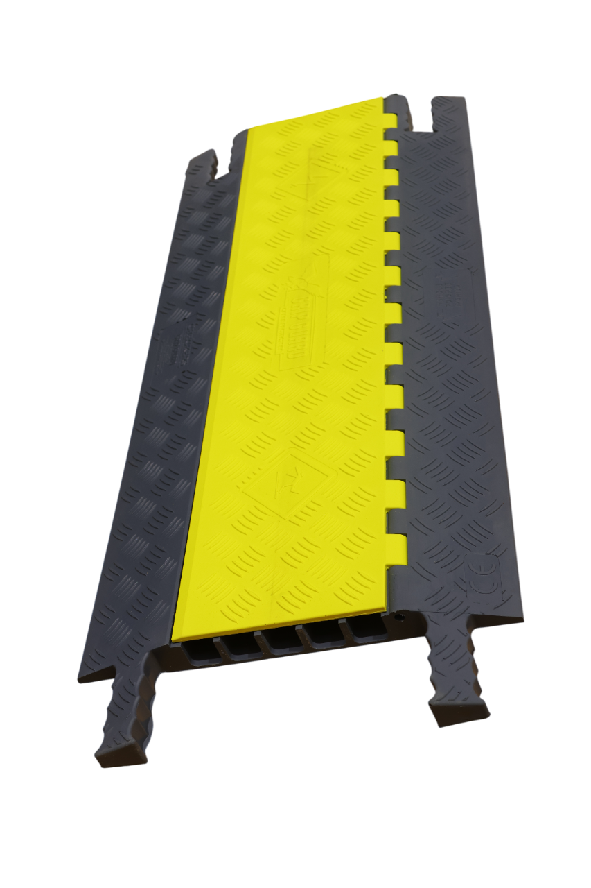 Protector de cable de 5 canales con sistema Grip Guard y conectores tipo Gripper. Diseñado para proteger cables eléctricos en zonas de alto tráfico vehicular y peatonal. Su diseño robusto permite una capacidad de carga de hasta 4.5 toneladas, ideal para eventos, industria o construcción.